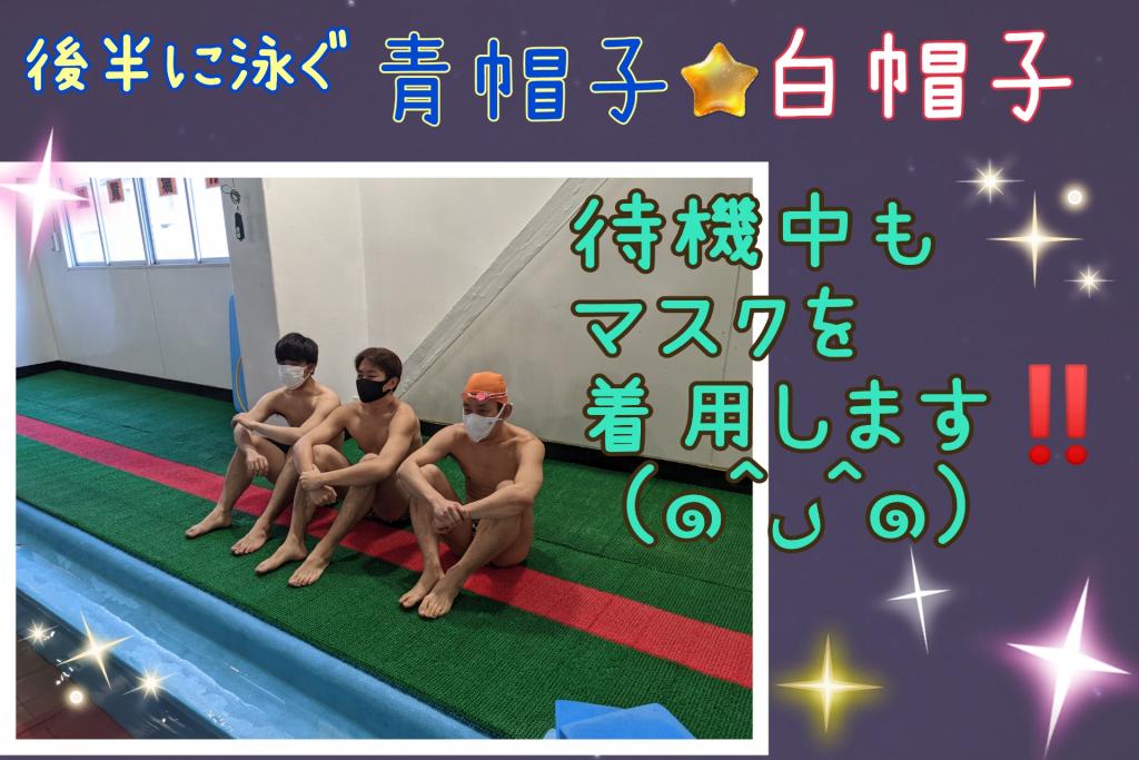 [ 2021/02/27 ] GSC大会(*´∀`*) 進級テスト編② 「待機中マスク着用」 50m以上種目のテストを受ける子達は 最初ウォーミングアップをしています😃 アップ終了後、 後半の青帽子さん白帽子さんは プールサイドでの待機中も マスク着用となりました( *´︶`*) プールへ降りる時にマスクを忘れないようにお願い致します(*´╰╯`๓)♬ | 10:00 AM | comments(x) | trackback(x) |